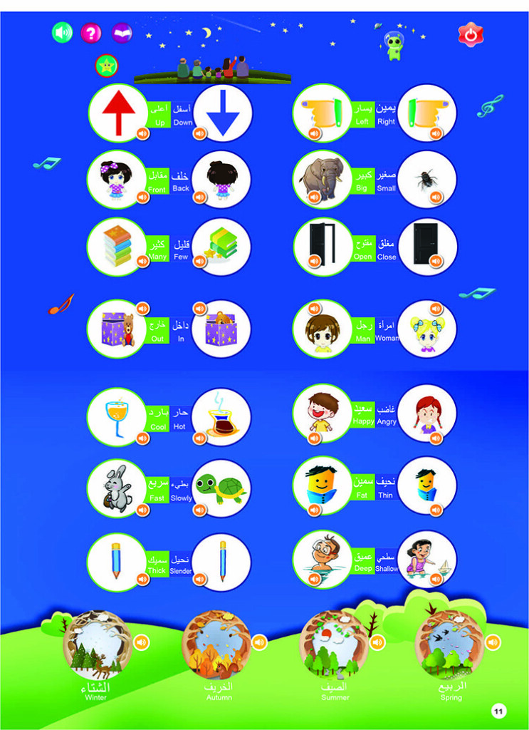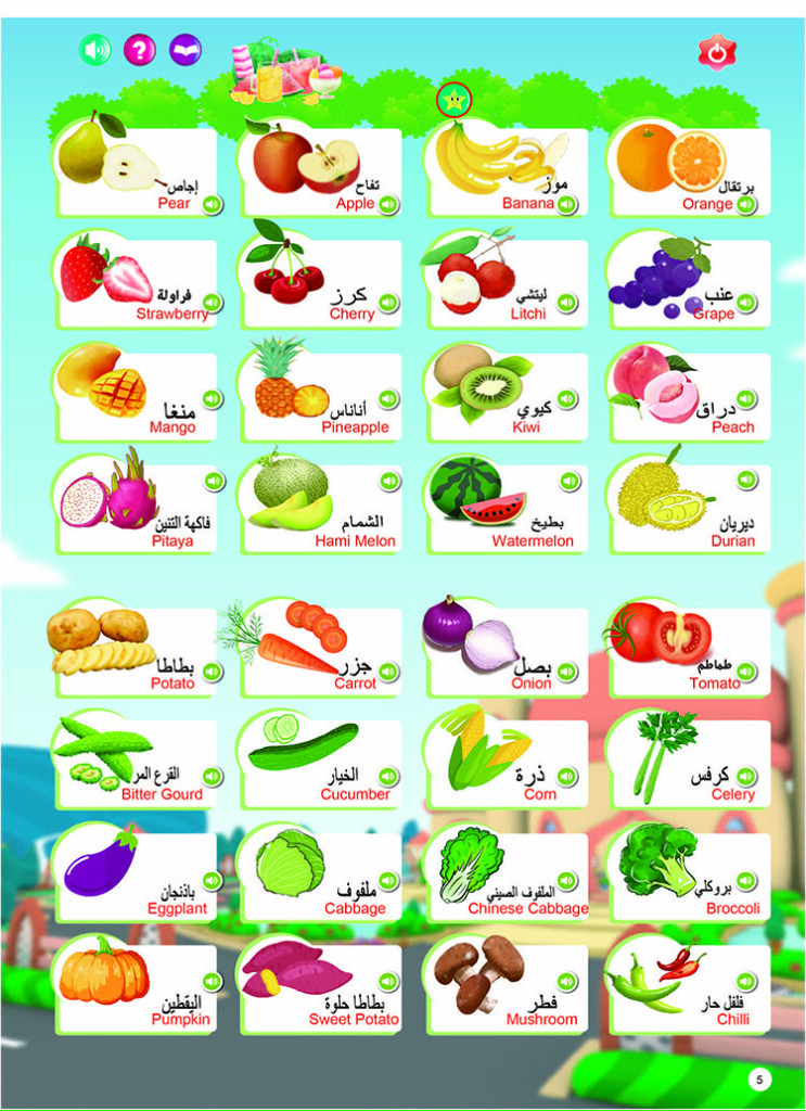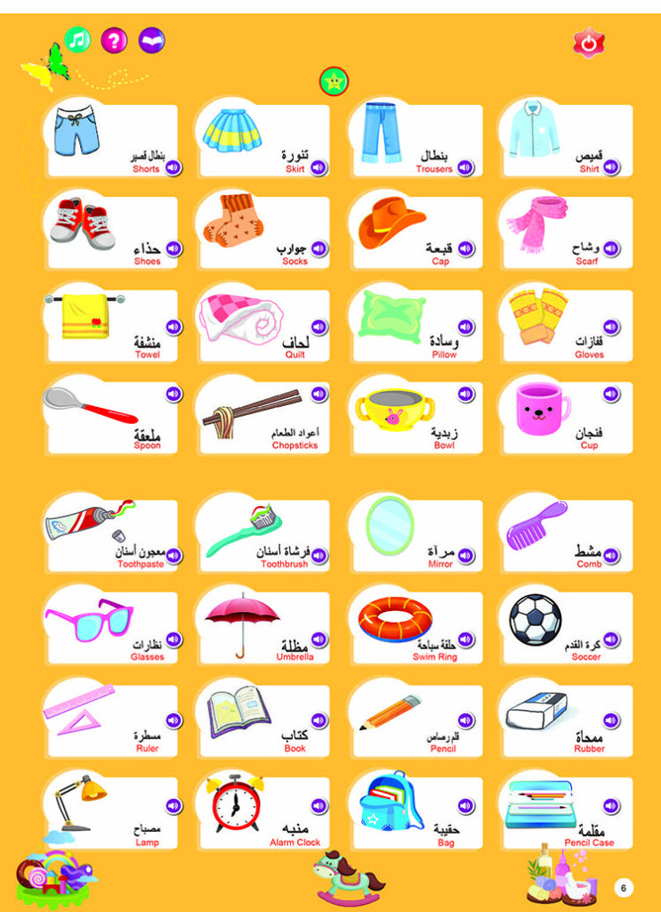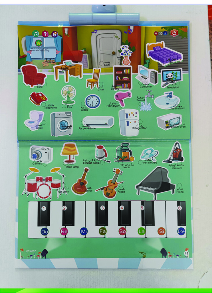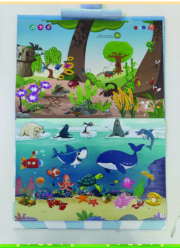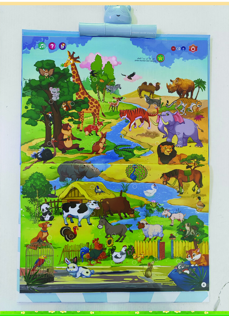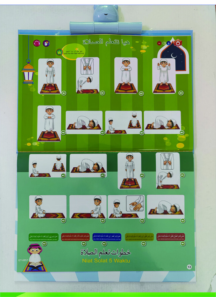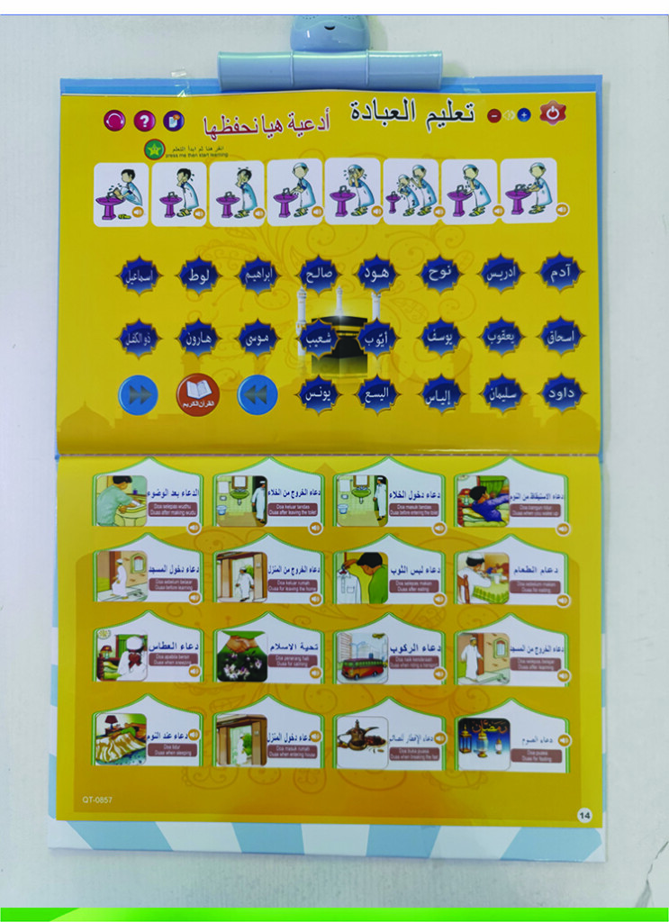 | Product function | 1)English letters 2)Numbers 3)Animals 4)Marine animal 5)Fruit&Vegetables 6)Things 7)Body 8)Foods 9)Shape 10)Vehicles 11)opposite&seasons 12)Duaa 13)Household items. |