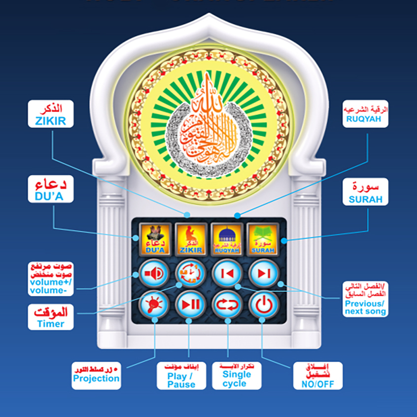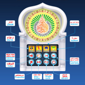 | Product function | 1)65 Surah of Holy Quran 2)24 Short Surah of Holy Quran 3)40 DUAA 4)5 Projection 5)11 Anashid |
