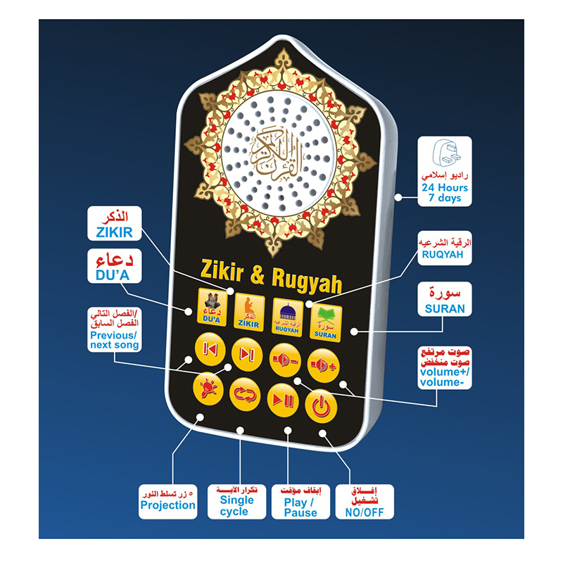 | Product function | 1)65 Surah of Holy Quran 2)24 Short Surah of Holy Quran 3)40 DUAA 4)5 Projection 5)11 Anashid |